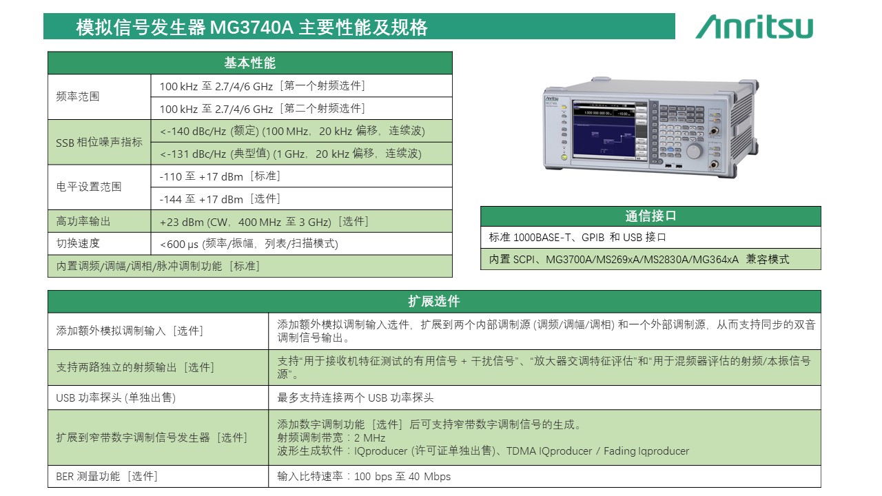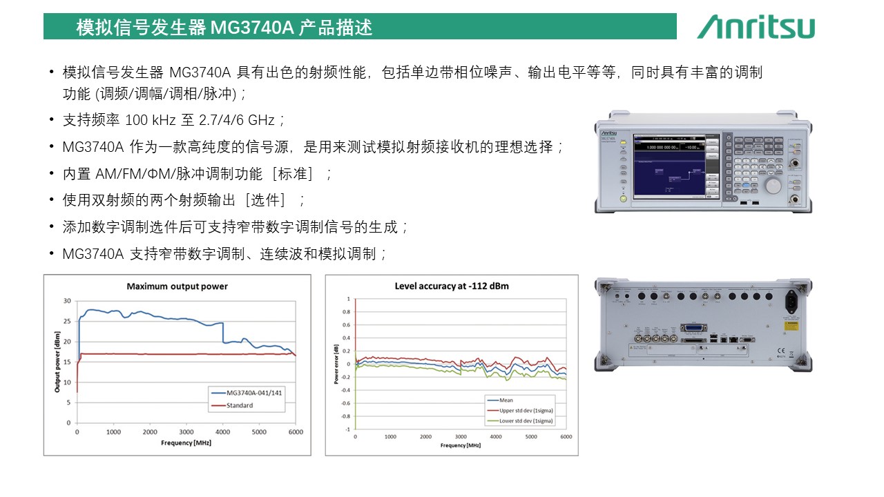 模拟信号发生器 MG3740A 具有出色的射频性能,包括单边带相位噪声、输出电平等等,同时具有丰富的调制功能 (调频/调幅/调相/脉冲)。 MG3740A 作为一款高纯度的信号源,是用来测试模拟射频接收机的理想选择。 此外,添加数字调制选件后可支持窄带数字调制信号的生成。 MG3740A 支持窄带数字调制、连续波和模拟调制。