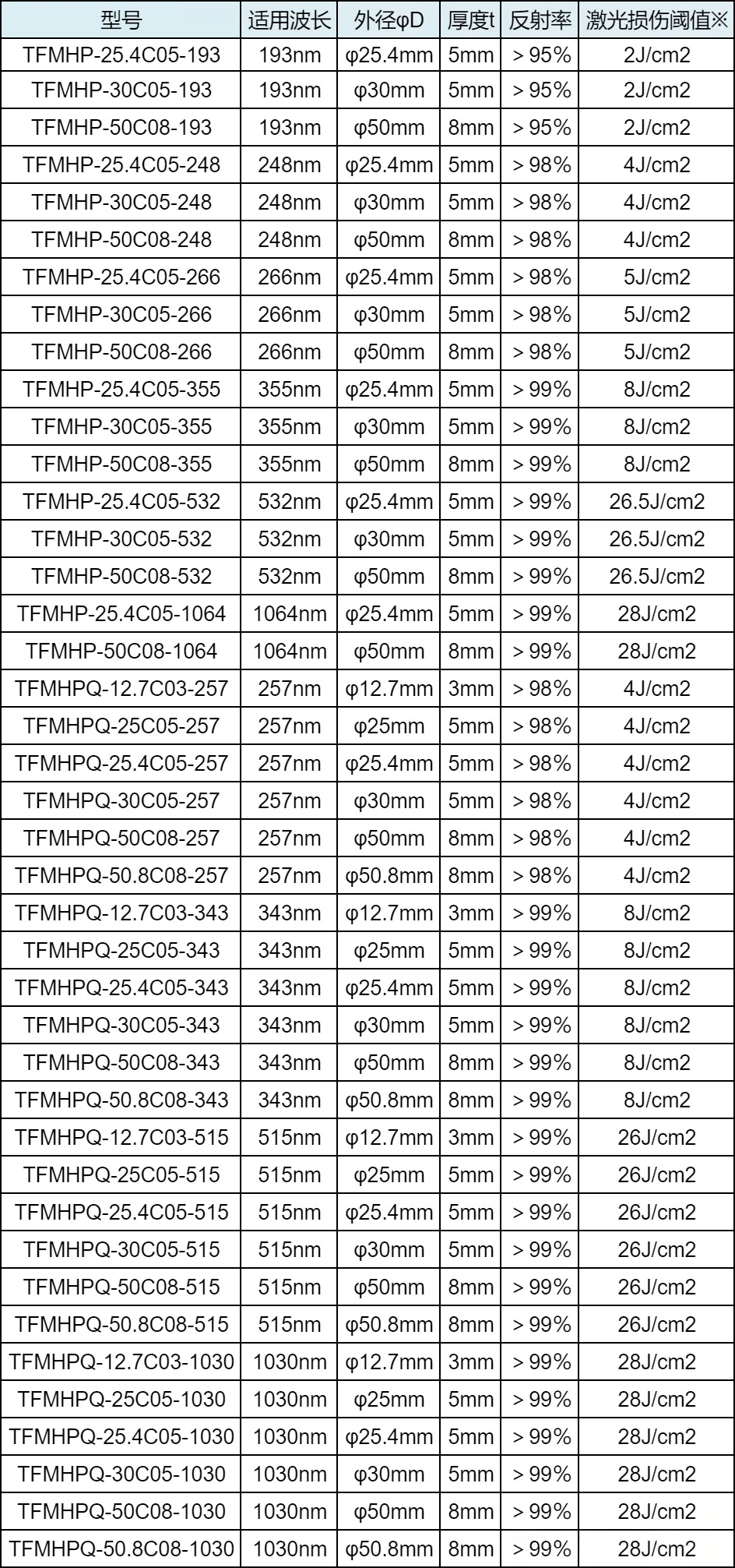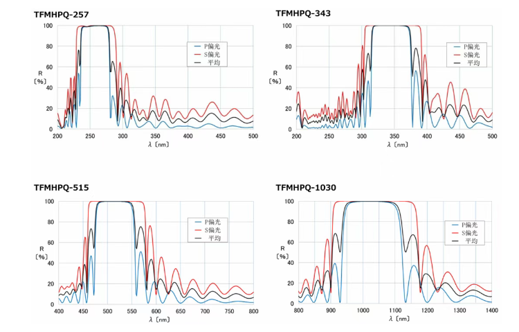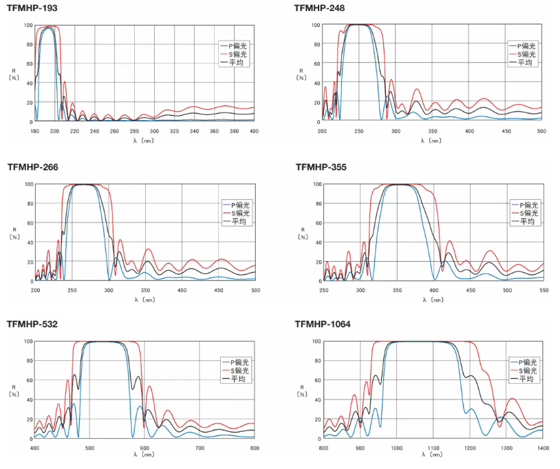 TFMHP系列: 可以提供用于YAG激光器,从基波(1064nm)到4次谐波(266nm)的Nd:YAG激光反射镜和ArF(193nm),KrF(248nm)的准分子激光用的反射镜,适用于高功率,脉冲Nd-YAG激光(或Yb-YLF激光)或准分子激光的光学系统的多层电介质膜反射镜。TFMPQ系列: 备有基波(1030nm),2次谐波(515nm),3次谐波(343nm),4次谐波(257nm)等多种波长使用的反射镜,特别适用于高功率的光纤激光系统使用的多层电介质膜反射镜。