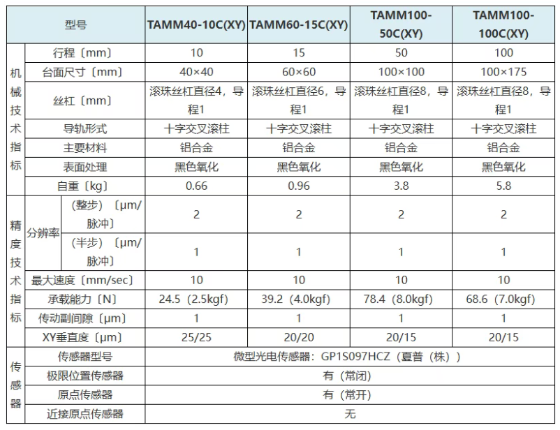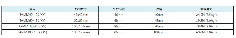 十字交叉滚柱导轨型铝合金XY轴电动位移台/十字交叉滚柱导轨型铝合金XY轴电动平移台/十字交叉滚柱导轨型铝合金XY轴自动滑台/十字交叉滚柱导轨型铝合金XY轴自动平台TAMM-XY轴阵容列表如下,TAMM-XY轴与TAMM-X轴相比,并未有产品型号尾缀含R的反手对称型自动平台,TAMM-XY轴的台面尺寸分别为40*40mm、60*60mm、100*100mm、100*175mm,行程范围为10mm-100mm。